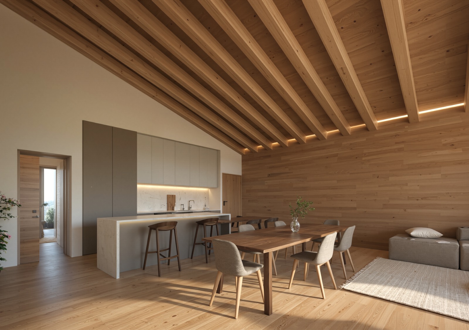 La distribución es funcional y acogedora. En la planta principal encontramos una amplia zona de día con techos altos, grandes ventanales y muchísima luz natural. El salón-comedor y la cocina abierta (con despensa) se integran en un espacio de casi 50 m² con salida a una terraza-jardín de 50 m² con vistas despejadas y total privacidad.