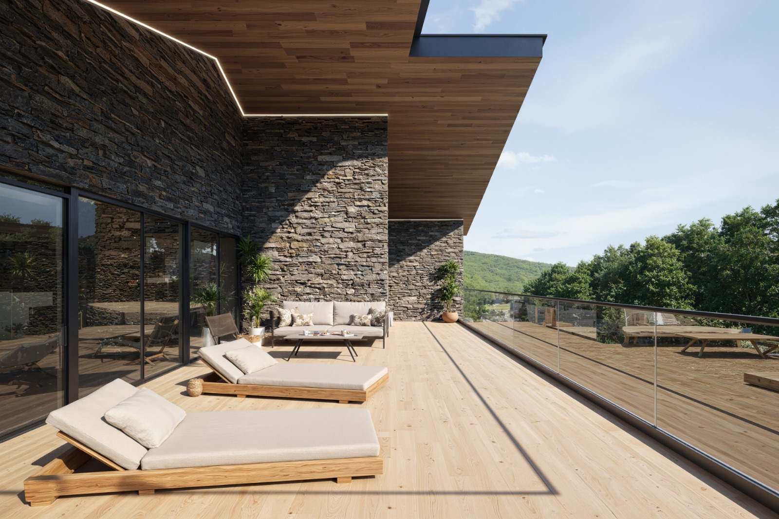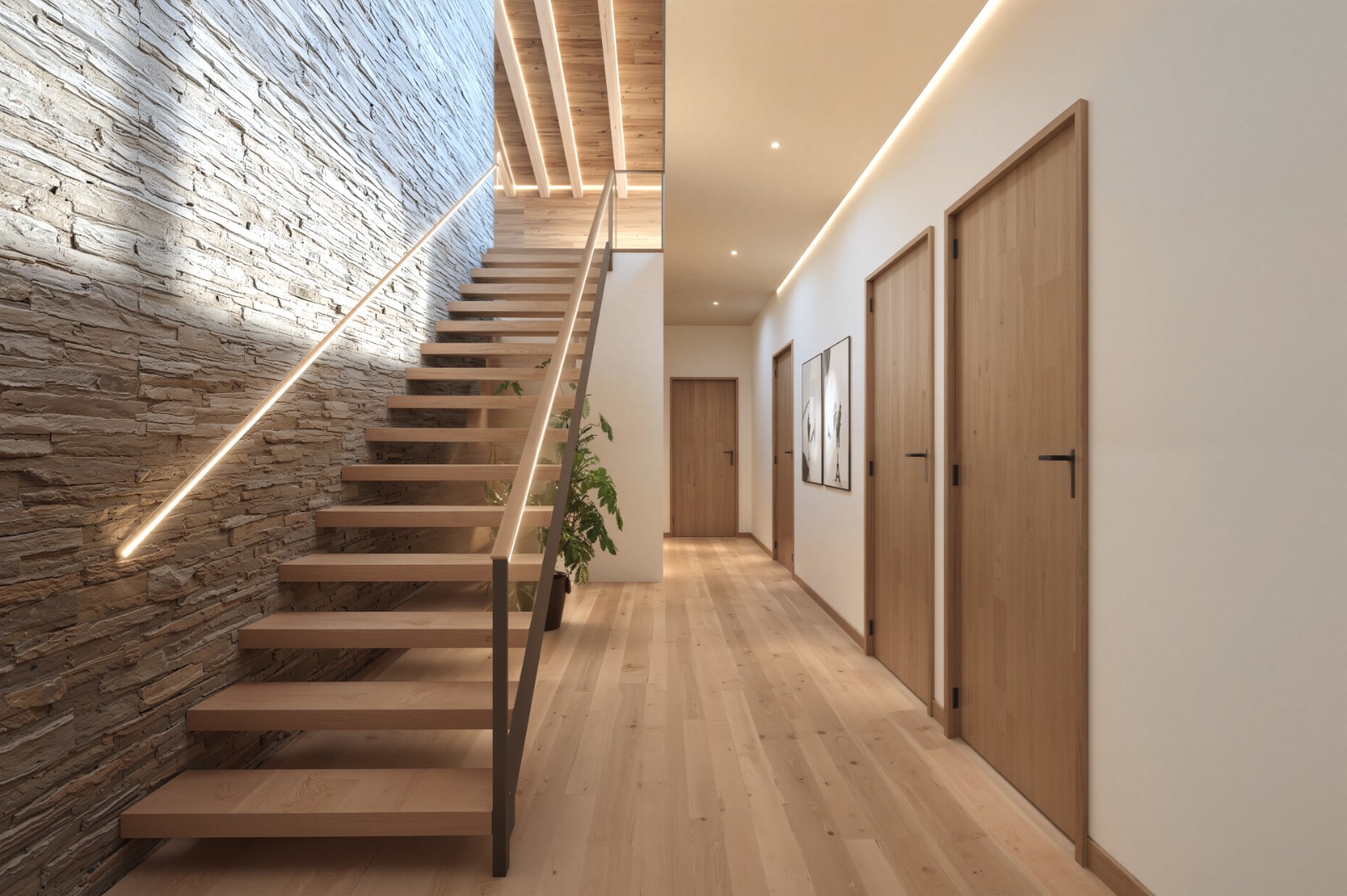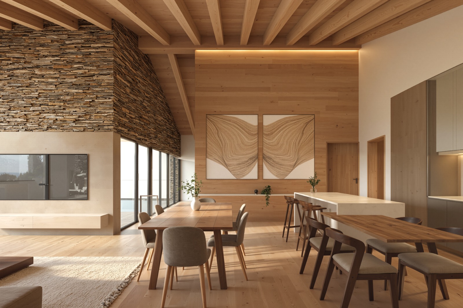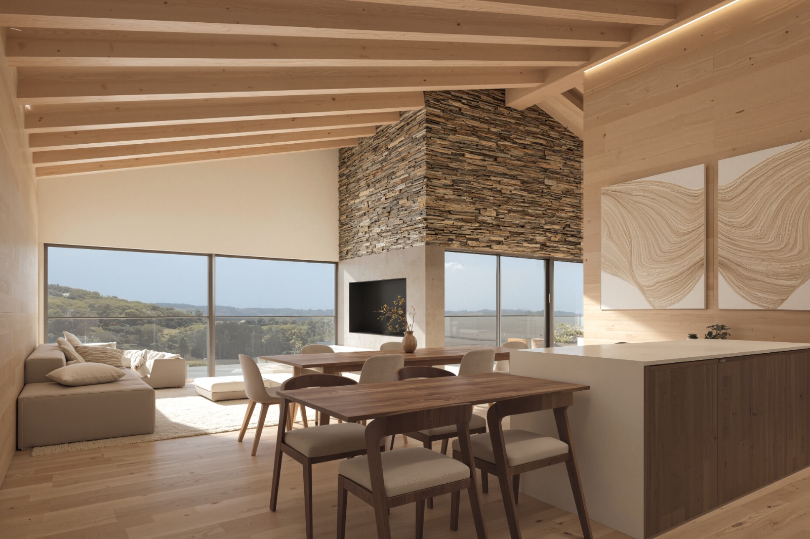 La distribució és funcional i acollidora. A la planta principal trobem una àmplia zona de dia amb sostres alts, grans finestrals i moltíssima llum natural. El saló-menjador i la cuina oberta (amb rebost) s’integren en un espai de gairebé 50 m² amb sortida a una terrassa-jardí de 50 m² amb vistes obertes i privacitat total.